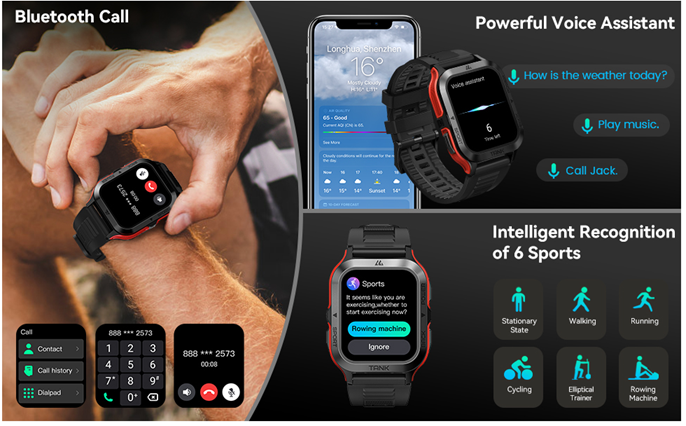 • ⌚IndustryLeading dual smart chip - ① AI Voice Assistant & Make Calls: A very handy tool built in the watch. Use your voice to give instructions and the voice assistant will do the rest. You can ask questions, play your desired music, and check weather, set alarms and timers. You can also make voice calls through the voice assistant, makes the scenes that are inconvenient to hold a mobile phone in daily exercise and life more concise and smart. ② Intelligent sports recognition: features BioTracker PPG optical sensor and the advanced AI algorithm,M2 enables smart recognition of 6 sports. The system can automatically sense current sports status without entering Sports Modes manually.