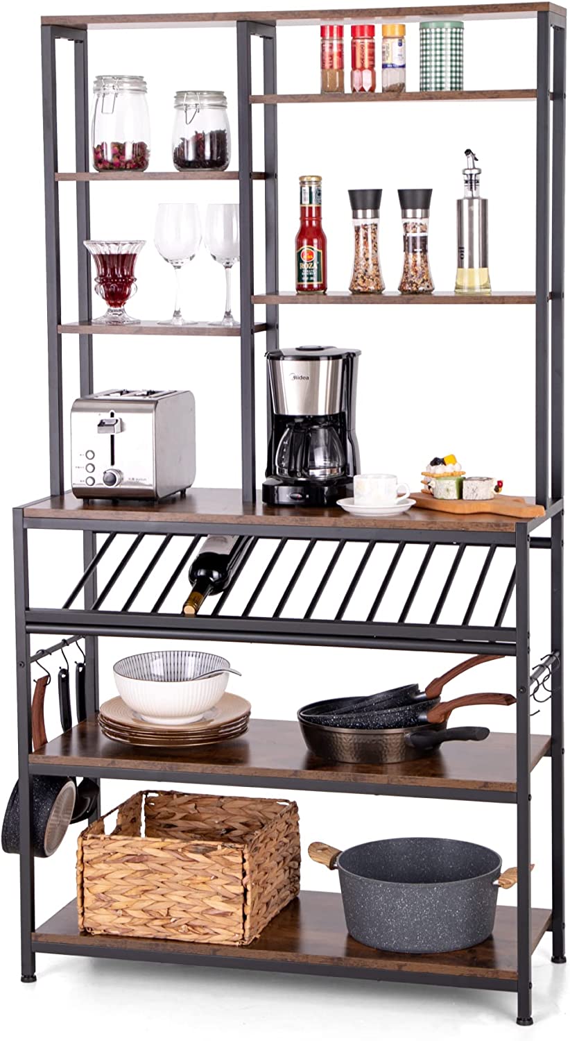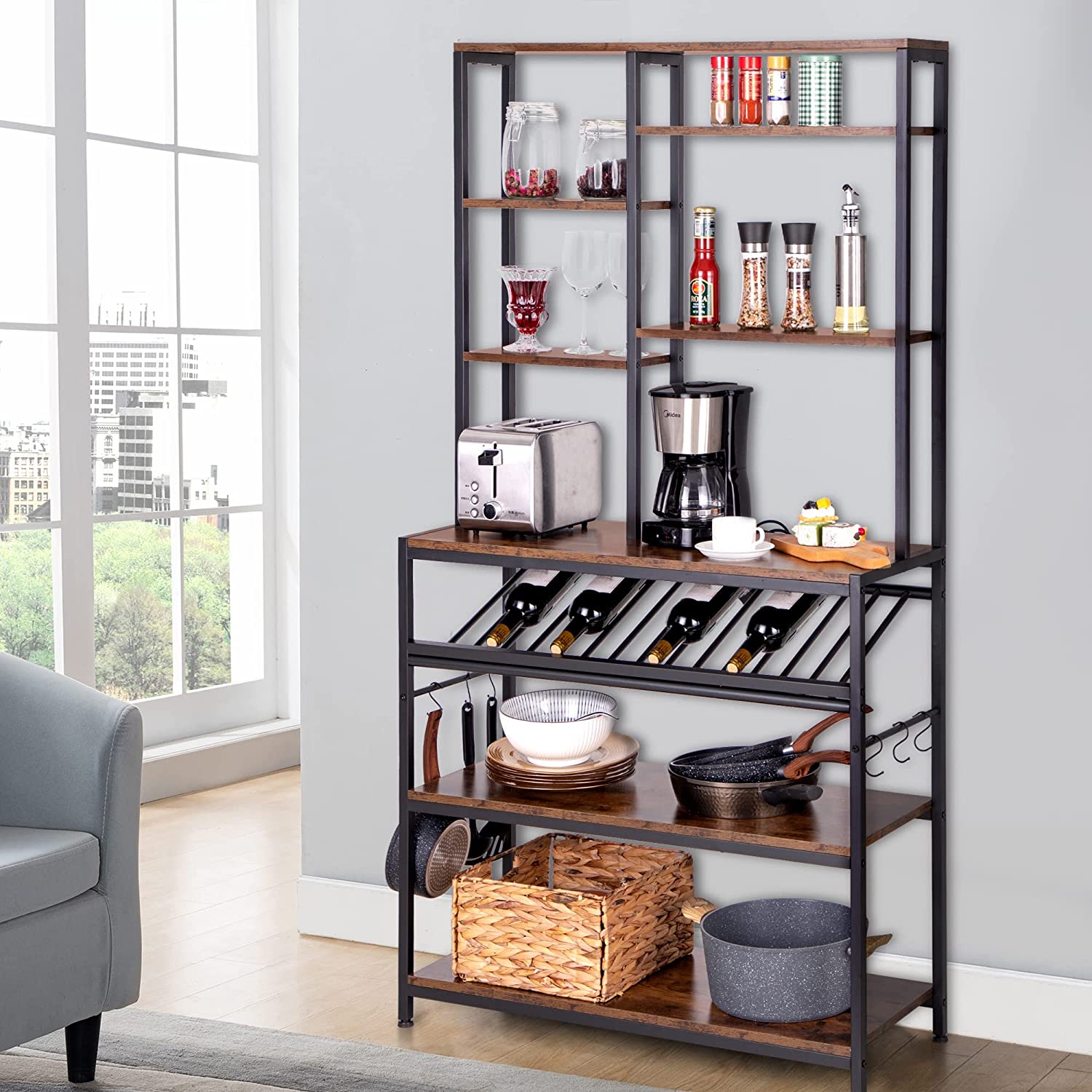MAISON ARTS Bakers Racks for Kitchens with Storage, Microwave Stand Coffee Bar Station with 6 Hooks Wine Storage, Industrial Kitchen Shelf, Rustic Brown