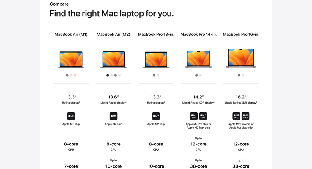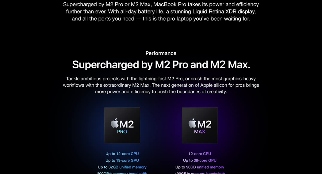 SUPERCHARGED BY M2 PRO OR M2 MAX — Take on demanding projects with the M2 Pro or M2 Max chip. M2 Pro has up to 12 CPU cores, up to 19 GPU cores, and up to 32GB unified memory. M2 Max has 12 CPU cores, up to 38 GPU cores, and up to 96GB unified memory.