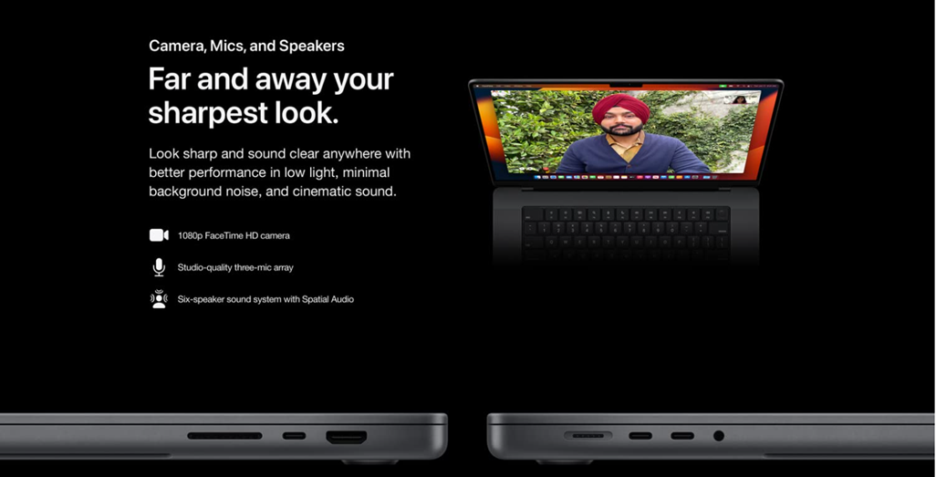 | Charging and Expansion | Three Thunderbolt 4 (USB-C) ports with support for: Charging, DisplayPort, Thunderbolt 4 (up to 40Gb/s), USB 4 (up to 40Gb/s); SDXC card slot, HDMI port, 3.5 mm headphone jack, MagSafe 3 port |