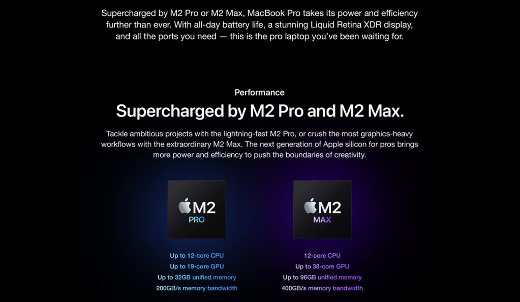 | Processor | System on Chip (SoC), Apple M2 Pro or M2 Max chip, 12-core CPU with 8 performance cores and 4 efficiency cores, Up to 38-core GPU, 16-core Neural Engine, Up to 400GB/s memory bandwidth |