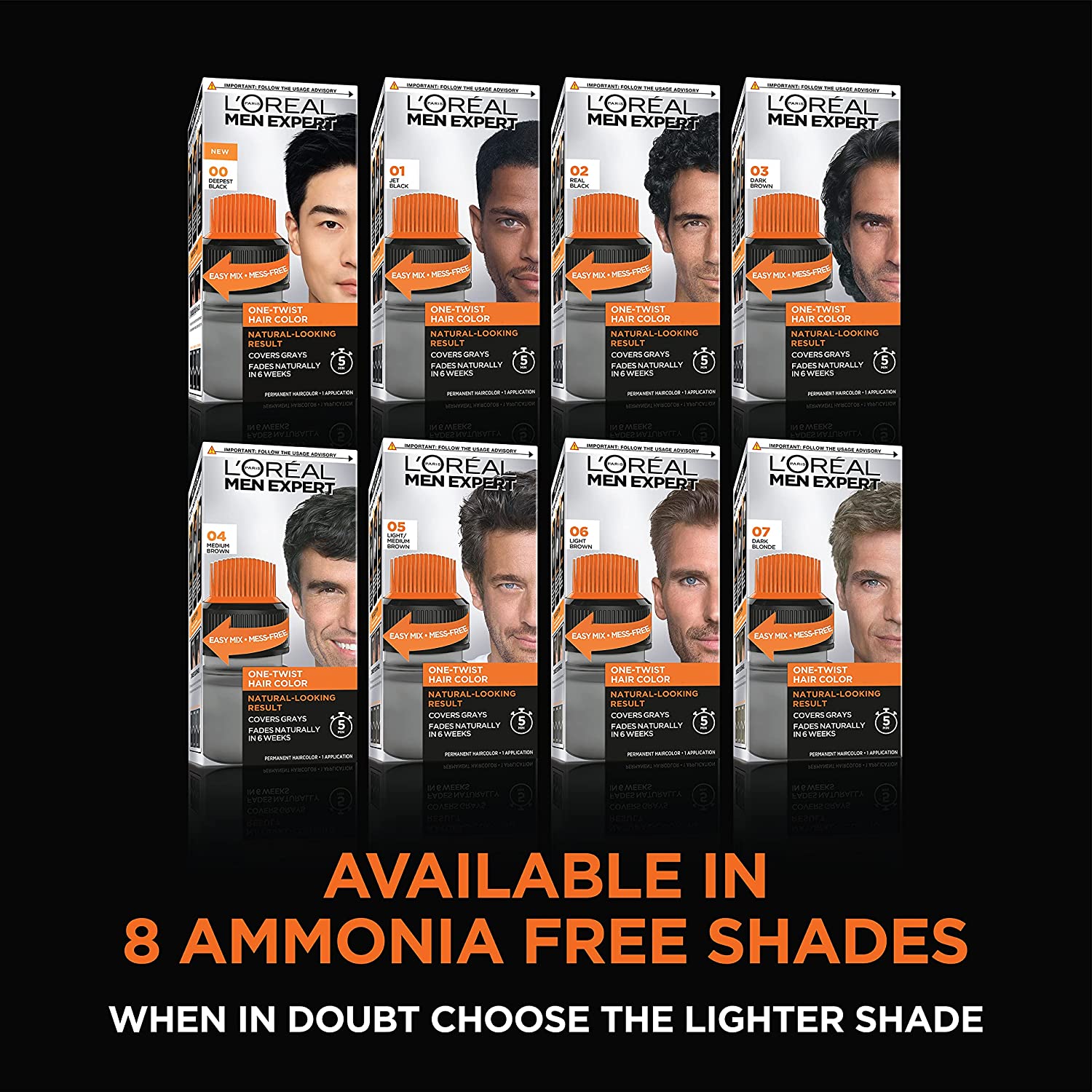 • L'Oreal has created a collection of 7 natural looking mens hair color shades, varying from dark blonde to jet black. A permanent, ammonia free hair color that targets gray coverage