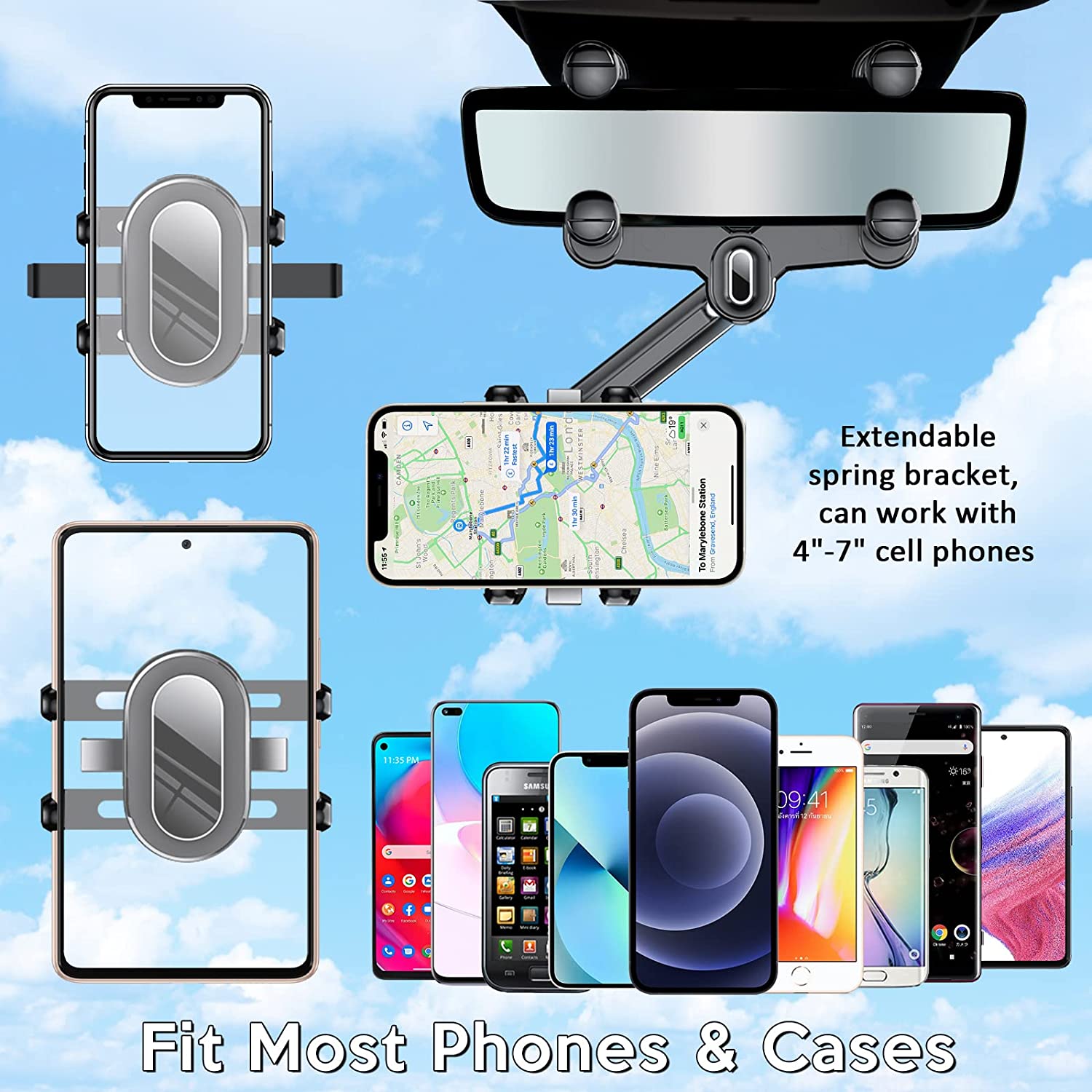 ?Rotatable and Retractable Car Phone Holder - The multifunctional car rearview mirror phone holder with 360° rotation design, you can put your phone in any direction (horizontal, vertical and more) as you like to enjoy the best driving experience. The arm length can be telescoped 0-5cm without obstructing your vision and ensure a safer travel for you and your family.