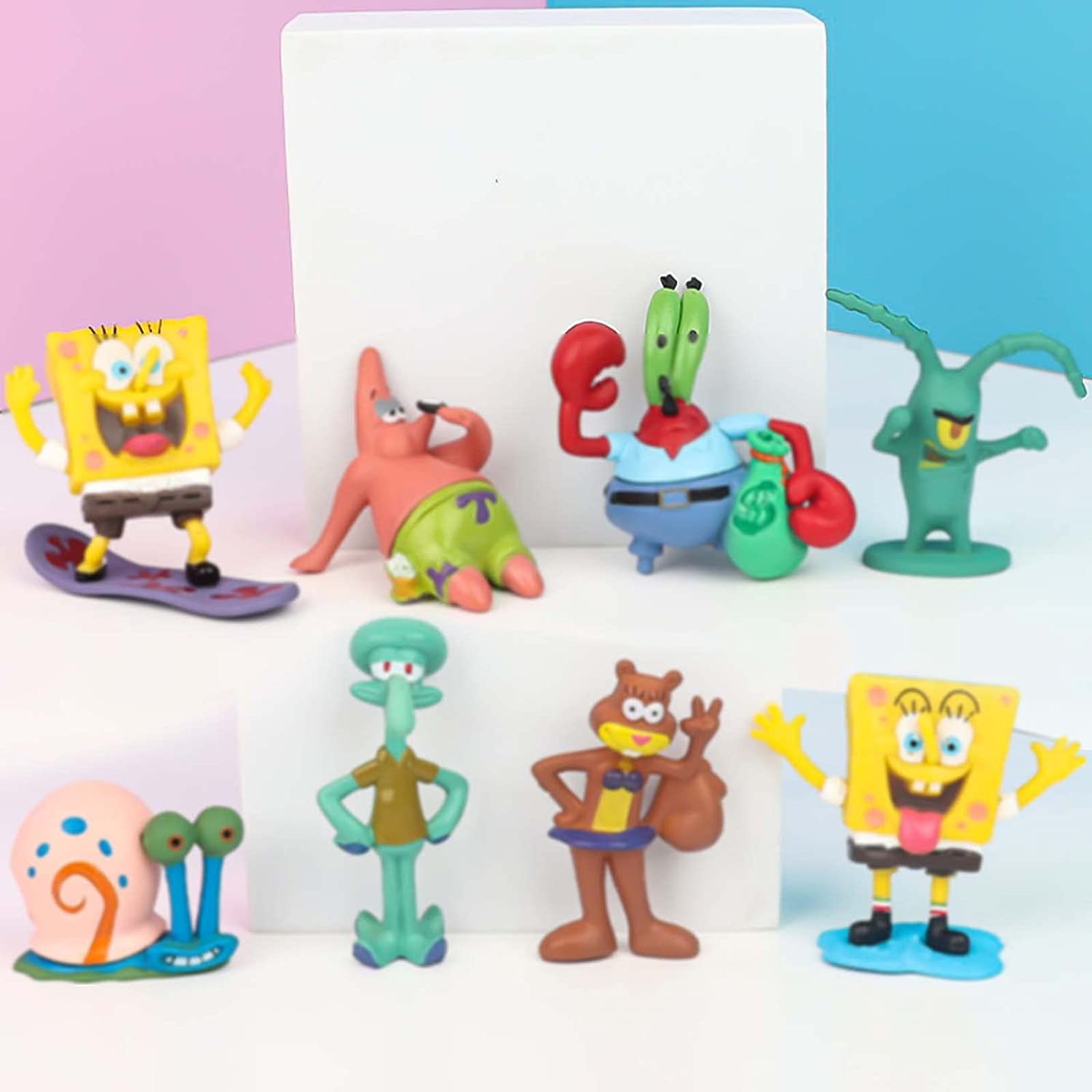 8 piece figurine playset with characters from the hit tv show... Spongebob Squarepants! These are great for cake toppers to decorate a cake, to give as birthday party favors, or to use as toys to play with! These are genuine toys. No retail box or retail packaging. All characters are individually wrapped in clear bags and sealed together in a clear OPP/CPP bag. Toys may have slight imperfections but doesn't affect overall appearance. We will ship in a box to ensure safe delivery! SUPER CUTE!! This Set includes: Spongebob - 2 inches Spondebob (surfing) - 2 inches Patrick Star - 1.5 inches Squidward - 2.5 inches Mr. Krabs - 2.25 inches Sandy Cheeks - 2.25 inches Gary - 1.5 inches Plankton - 2 inches