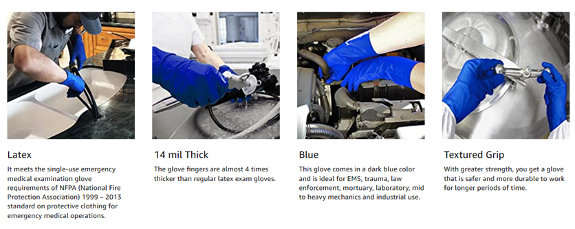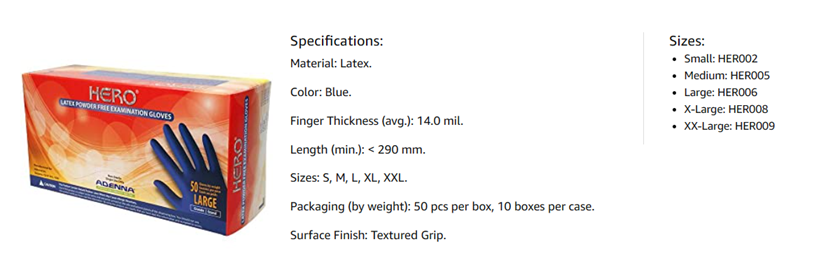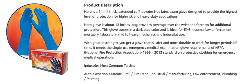The Adenna HERO High Risk Exam Glove is a 14 mil thick, extended cuff, powder free latex exam glove designed to provide the highest level of protection for high-risk and heavy-duty applications. The glove fingers are almost 4 times thicker than regular latex exam gloves. The HERO Exam Glove is about 12 inches long and provides coverage over the wrist and forearm for additional protection. This glove comes in a dark blue color and is ideal for EMS, trauma, law enforcement, mortuary, laboratory, mid to heavy mechanics and industrial use. With greater strength, you get a glove that is safer and more durable to work for longer periods of time. It meets the single-use emergency medical examination glove requirements of NFPA (National Fire Protection Association) 1999 - 2013 standard on protective clothing for emergency medical operations.