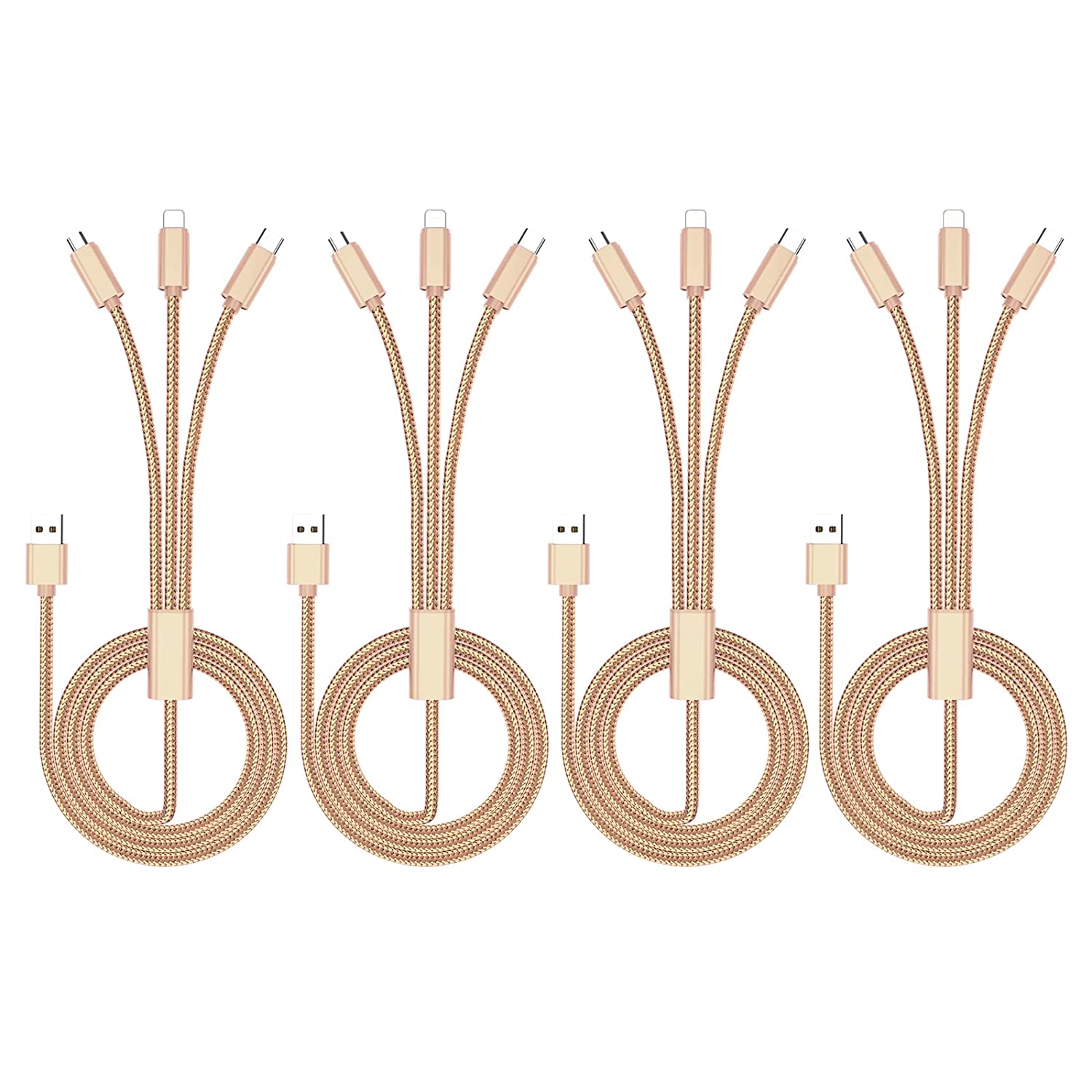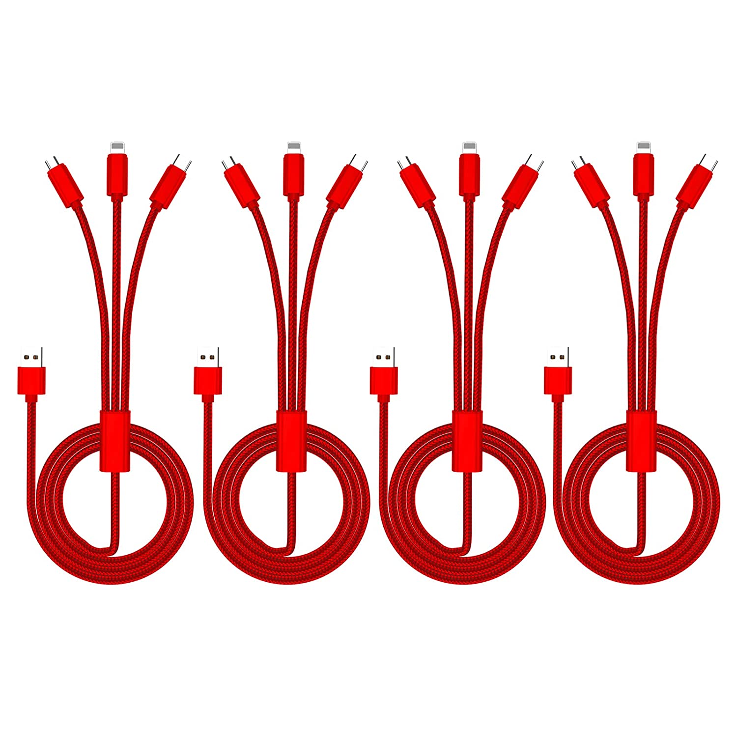 Multi Charging Cable, 4Pack/4FT 3 in 1 Fast Charging Cord Adapter with USB-C, Type C/Micro USB Port Connectors, Nylon Braided Universal Multiple USB Cable for Cell Phones, Android Devices - Red