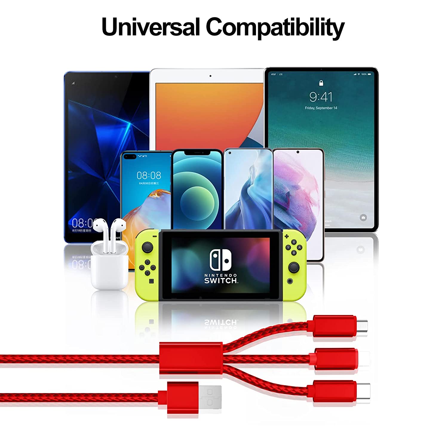 【Portable and Convenient 】 3-in-1 Multi Charging Cables is multifunctional integration design. One universal multi charging cable meets a variety of everyday needs. USB-C & Micro USB Cable universal charger cord support to charge most of the cell phones, this charger cable you can charging multiple devices at the same time instead of taking more cables with you, one cable is enough! Please Note it is ONLY FOR CHARGING NOT FOR SYNCING DATA.