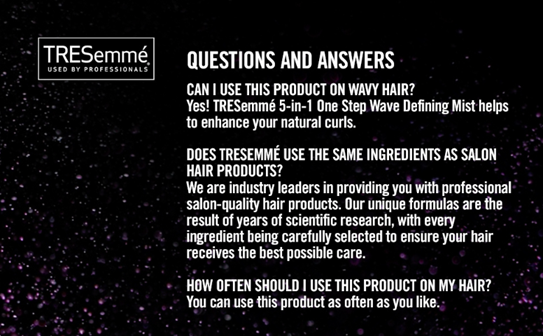Derived from professional hair treatments, TRESemmé One Step 5-in-1 Wave Defining Mist is a multitasking hair styling and texture spray formulated to enhance waves, add volume, heat protect, control frizz with a soft hold and give your hair a beautiful, glossy shine and a smoothness you'll love. This TRESemmé One Step 5-in-1 Wave Defining Mist will amplify and simplify your hair styling routine by delivering style, treatment and benefit all in one hair mist. This hair care product makes your styling routine easier by providing 5 benefits in one step! How can you attain your hair goals in ONE SIMPLE STEP? Simply spritz onto damp hair. Comb through. Air dry or diffuse while twisting hair around fingers. To create waves, blow dry then use a flat iron or curling iron. We've always understood that style is more than a look: it's a part of you. With our professional quality care, a world of style possibilities is yours to achieve. Every choice we make at TRESemmé, from the values we promote-such as not testing on animals and being PETA-approved-to the stylists we work with, down to the carefully selected ingredients we use, are made with intention and inspired by the latest trends and style. Because 70 years on, we believe in the power of style. So tell your story, land that job, make your mark – and achieve your aspirations with confidence. With TRESemmé, your style can match your ambition.