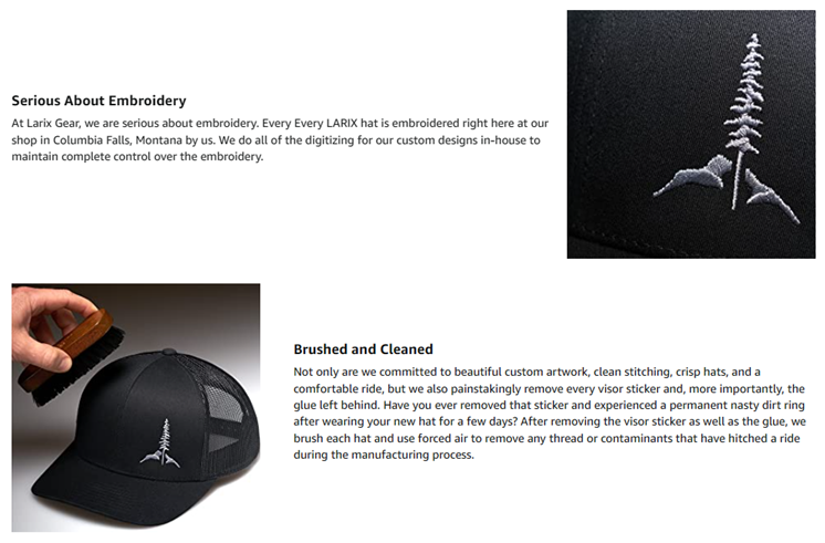 • SERIOUS ABOUT EMBROIDERY : Every Larix hat is embroidered right here at our shop in Columbia Falls Montana by us. It's our highest priority to achieve outstanding results by using the most advanced sewing technology and techniques available today.