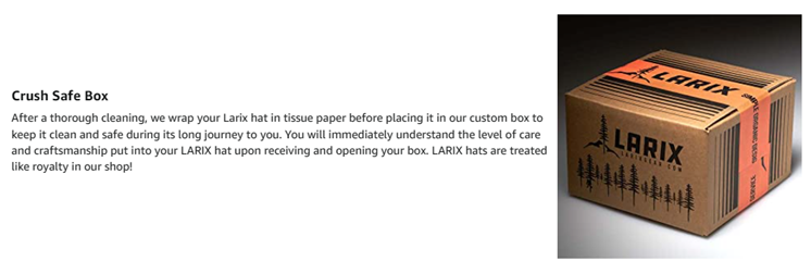 • SHIPPED IN BOX : After your hat has been cleaned and prepped we wrap your Larix hat in tissue paper before placing it in our custom box to keep it clean and safe during its long journey to you. IF YOUR HAT DOESN'T ARRIVE IN A BOX PLEASE REACH OUT TO US DIRECTLY TO LET US KNOW. You will immediately understand the level of care and craftsmanship put into your Larix hat upon receiving and opening your box.