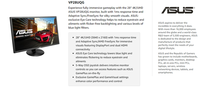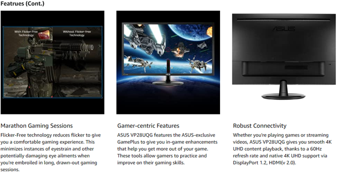 Experience fully immersive game play with the 28" 4K/UHD ASUS VP28UQG monitor, built with 1ms response time and adaptive Sync/free Sync for silky smooth visuals. Asus-exclusive eye Care technology helps to reduce eyestrain and ailments with flicker-free backlighting and various levels of blue light filters. Color temperature selection - 4 modes.