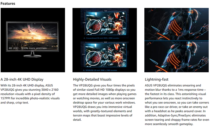 - 28 inches 4K/UHD (3840 x 2160) with 1ms response time and Adaptive Sync/AMD Free Sync for immersive, crisp visuals featuring Display Port and dual HDMI connectivity; Viewing Angle (CR≧10) : 170°(H)/160°(V). HDCP : Yes