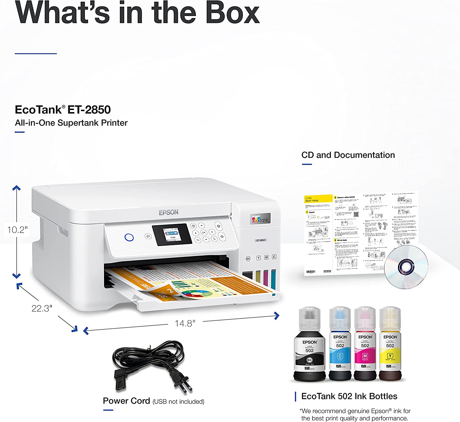 Epson EcoTank ET-2850 Wireless Color All-in-One Cartridge-Free Supertank Printer with Scan, Copy and Auto 2-Sided Printing - White