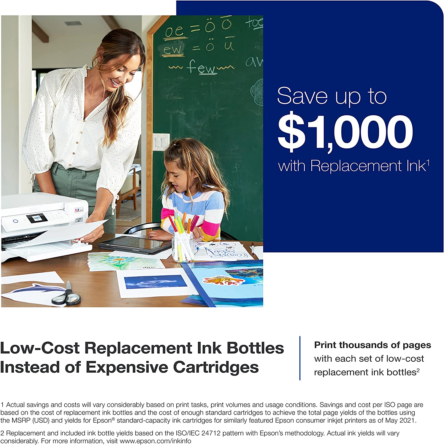 • Dramatic Savings on Replacement Ink ― Save up to 90% with replacement ink bottles vs. ink cartridges (1) – that’s enough to print up to 7,500 pages black/6,000 color (2), equivalent to about 90 individual ink cartridges (3)