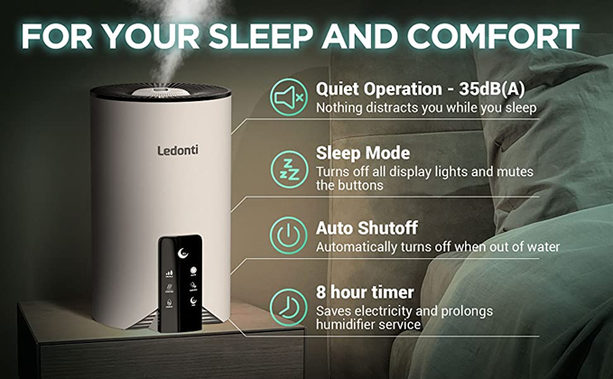 GREAT FOR YOUR BEDROOM. Sleep better and wake up healthier by having the optimal level of humidity in your room with Ledonti warm and cool mist humidifiers for bedroom quiet. Just set the desired parameters or use the auto-off feature to maintain the healthy and comfy environment in your nest.