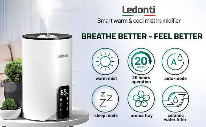 It’s time to consider our Ledonti warm and cool mist humidifier. A trendsetting design and utmost functionality are combined in one device that will exceed your expectations. It will make your home smarter and will create a favorable atmosphere in your family nest regardless of where you are. Ledonti air humidifier will keep the air moisture at an optimal level to ensure you and your family members stay healthy indoors.