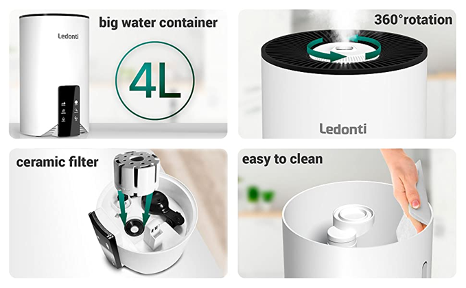 • Cold & Discomfort relief / timely support: Hydrate your body with the right amount of moisture in the air to have a healthy sleep, relieve itchiness, discomfort and cold symptoms with our air humidifier. In case you have questions about this device, contact our support team for more details. At Ledonti, you always have our back if any issues occur. Keep optimal humidity in the room and stay sound with the functional humidifier by Ledonti.