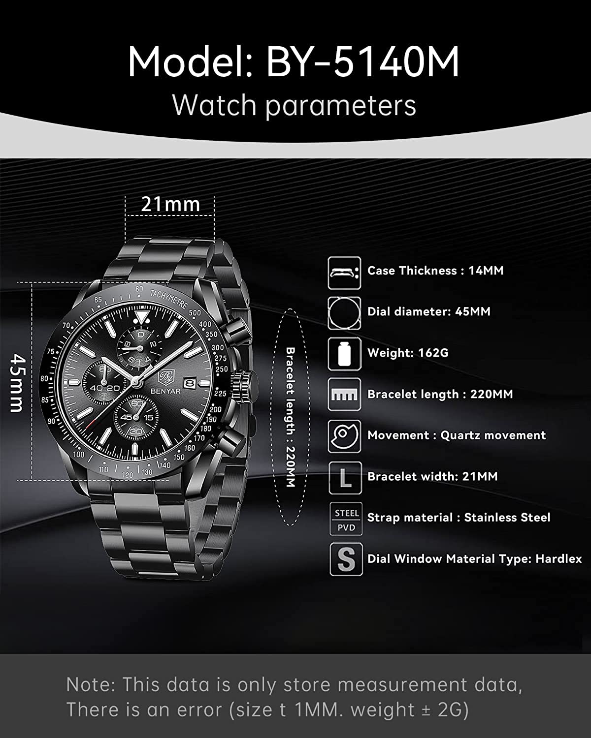 - ⌚ ELEGANT DESIGN: BY BENYAR offers a wide range of stylish luxury wrist watches specially crafted for men. The watch comes with 100% strong glass, black dial and tachymeter topring. The genuine stainless steel band with width 2.2cm and length 22cm give the watch a classy look. It is a multi-function chronograph with three sub-dial for second, minute and hour.