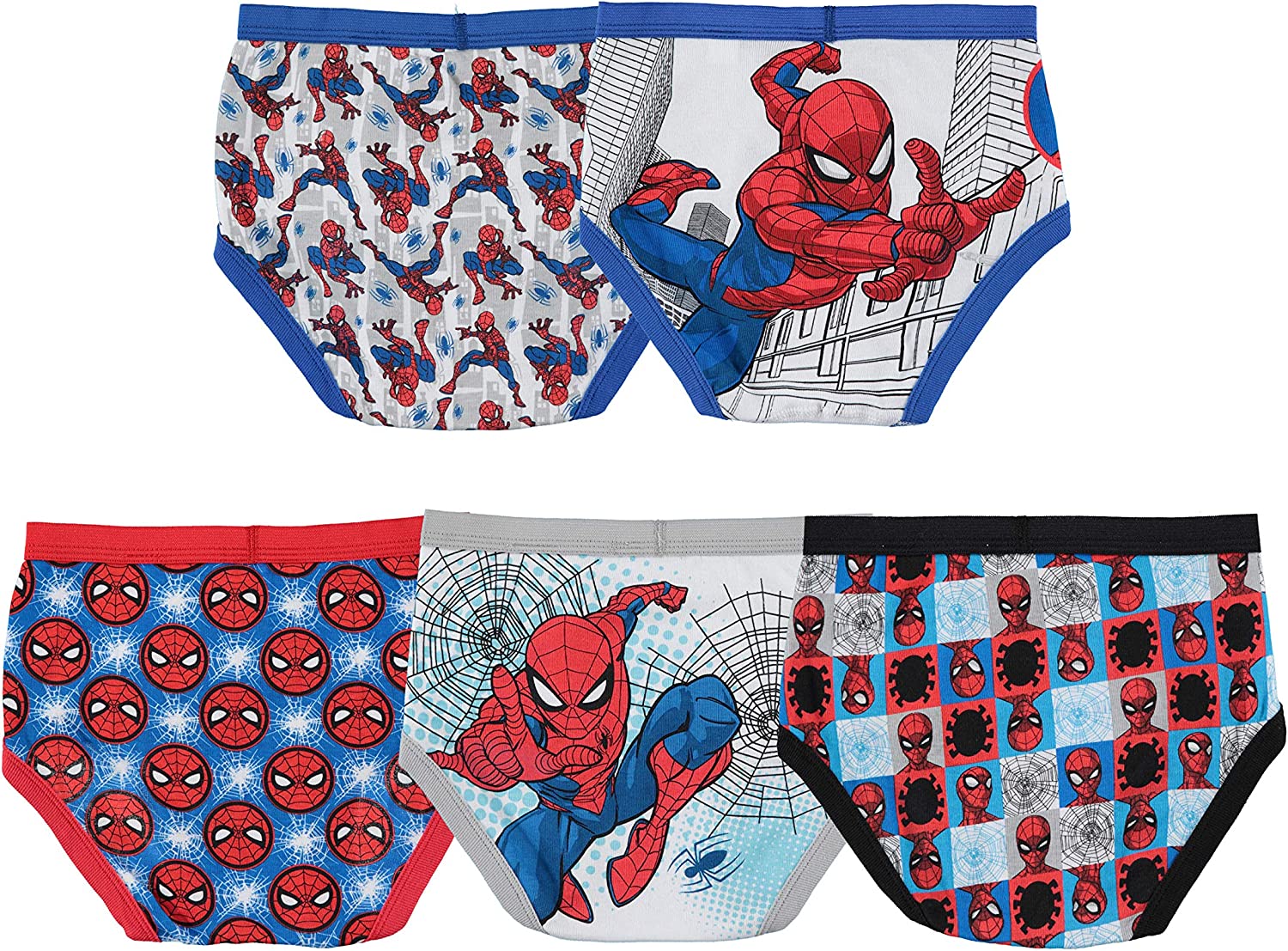 Five pairs of classic brief-style underwear in Spider-Man motif