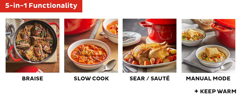 • 5-in-1 FUNCTIONALITY: Braise, slow cooking, sear or sauté, cooking pan and warmer, making it the perfect wedding gift, new home gift or bridal shower gift!