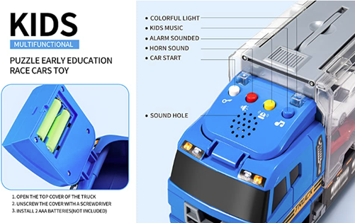 • ENRICH EARLY EDUCATION KNOWLEDGE - Our upgraded version of the race cars toy has a good early education function. Through the 4 buttons on the front of the truck, your child will see cool lights, hear the sound of the vehicle starting, the sound of the horn, the realistic police sound and the pleasant music. It is very suitable for parent-child education and cultivate children's imagination and creativity. There is a need for 2 AAA batteries (not included).