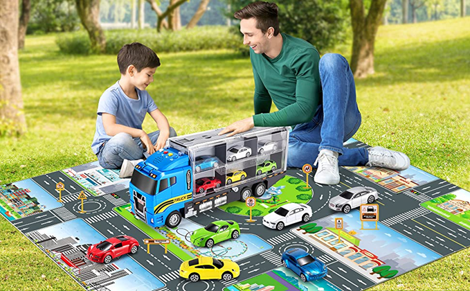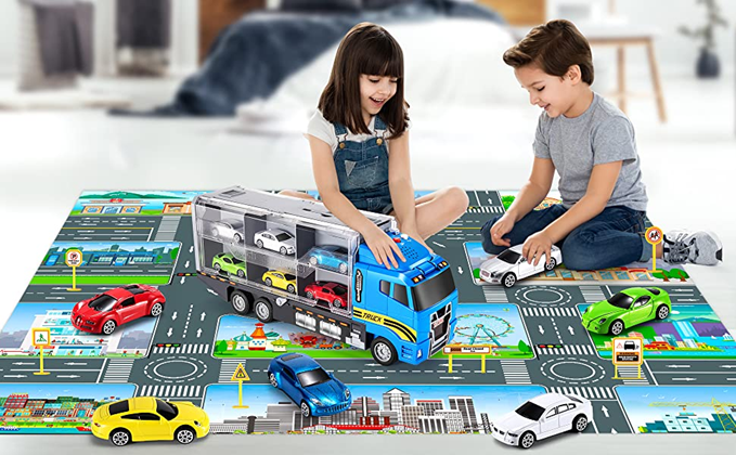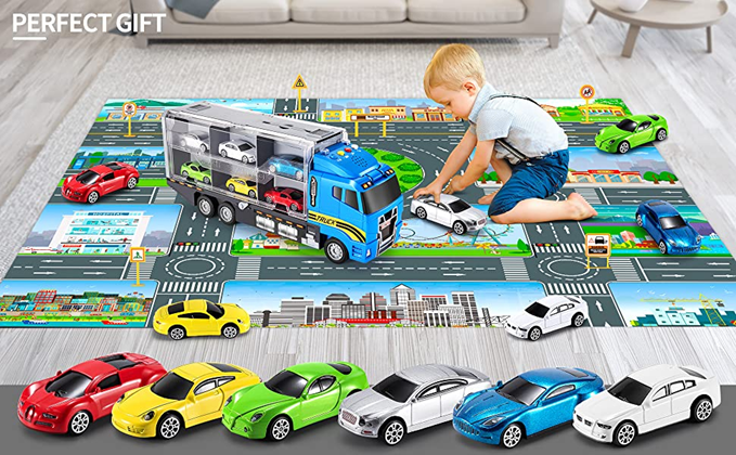 • KIDS RACE CAR TOYS SET - Equipped with 1 x foldable play mat, 1 x multi-function transport cars, 6 x different colorful die cast race cars and a set of road signs. It is highly recommended for kids aged 3 and above to create endless happy times!
