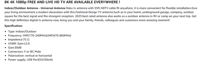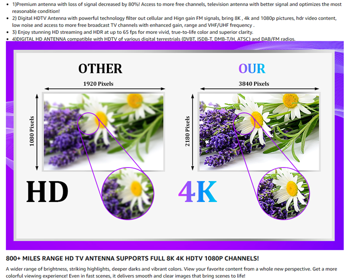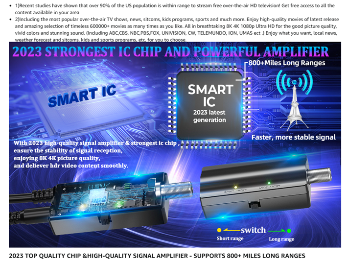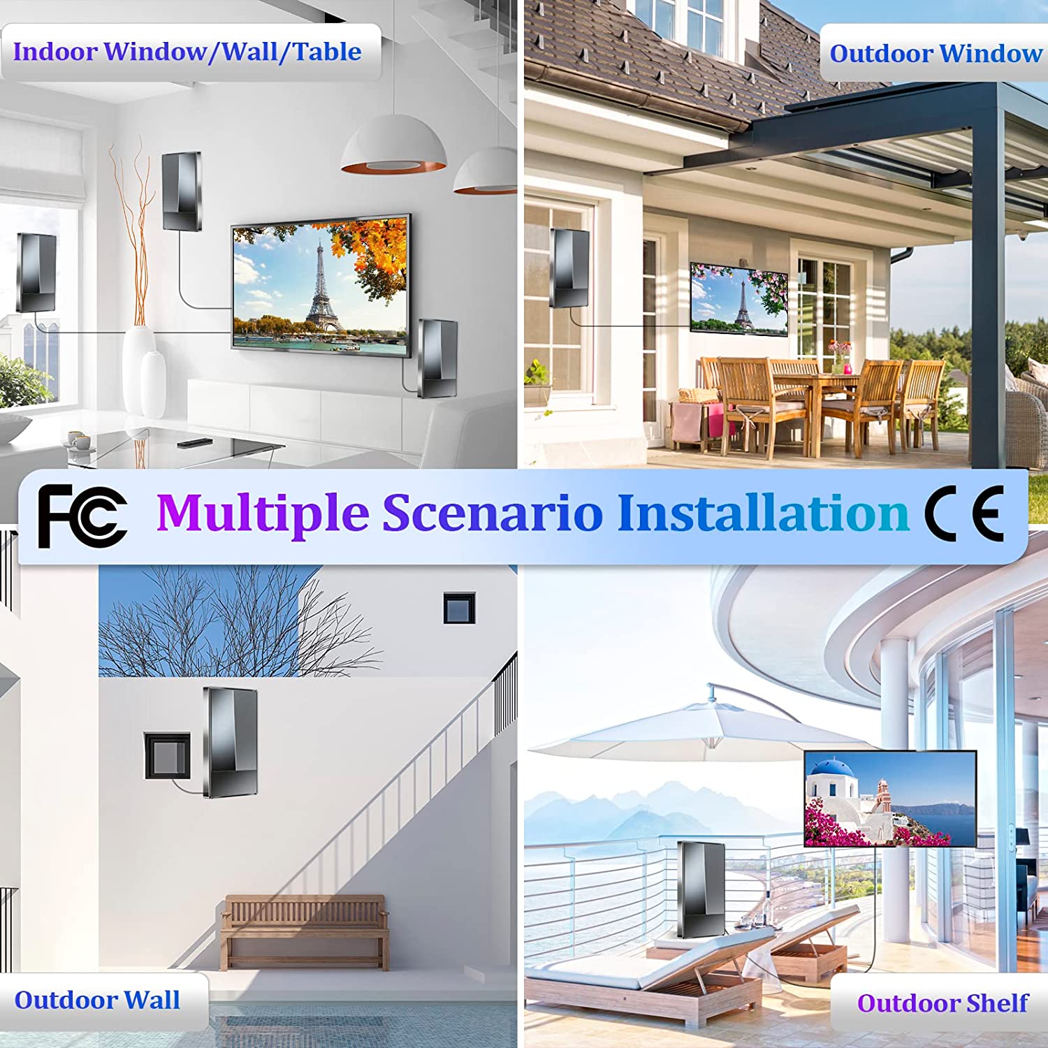 • ?▷【UPGRADED TO 800+ MILE LONG RANGE】- TV antenna for smart tv, equip with 2023 MOST POWERFUL built-in ic chip & HIGH-QUALITY signal amplifier, ensure the stability of signal reception,access to more free channels . Indoor/Outdoor tv antenna has high gain, bring clear pictures, low noise and access to most TV signals.Transfer 8k 4k combination of UHR and HDR video content. You deserved the 2023 Best & Oversized ANTENNA which offers more longer ranges on the market and lndustry-leading Power!