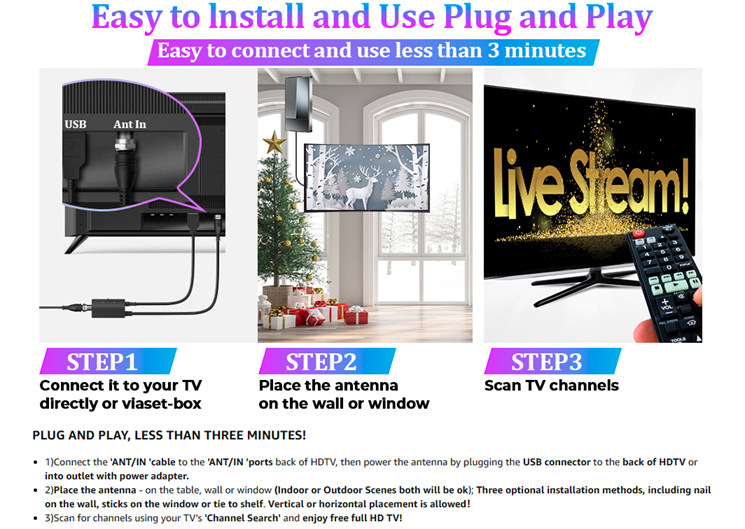 • ? 【VALUE PACKAGING】- TV antenna(10*20*2 inch), powerful antenna amplifier, coaxial cable, USB cable, 5V power adapter, the installation accessories of three installation methods include (① screw + screw sleeve, positioning jam, ② double sided adhesive tape , ③nylon cable ties ), instruction manual.