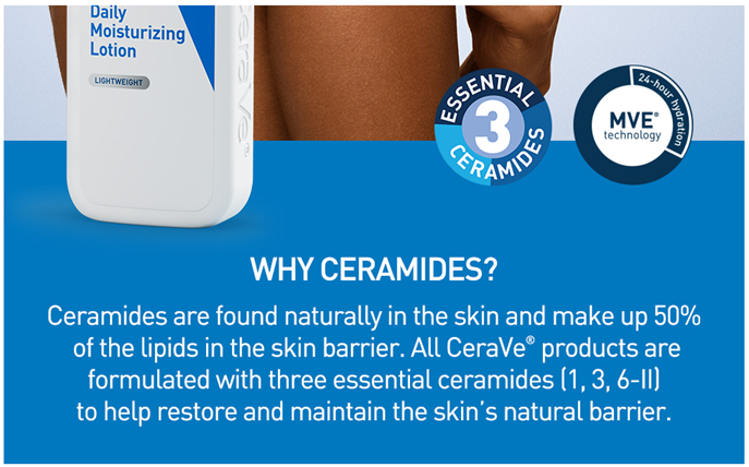 - [ 3 ESSENTIAL CERAMIDES ] Ceramides are found naturally in the skin and make up 50% of the lipids in the skin barrier. All CeraVe products are formulated with three essential ceramides (1, 3, 6-II) to help restore and maintain the skin’s natural barrier
