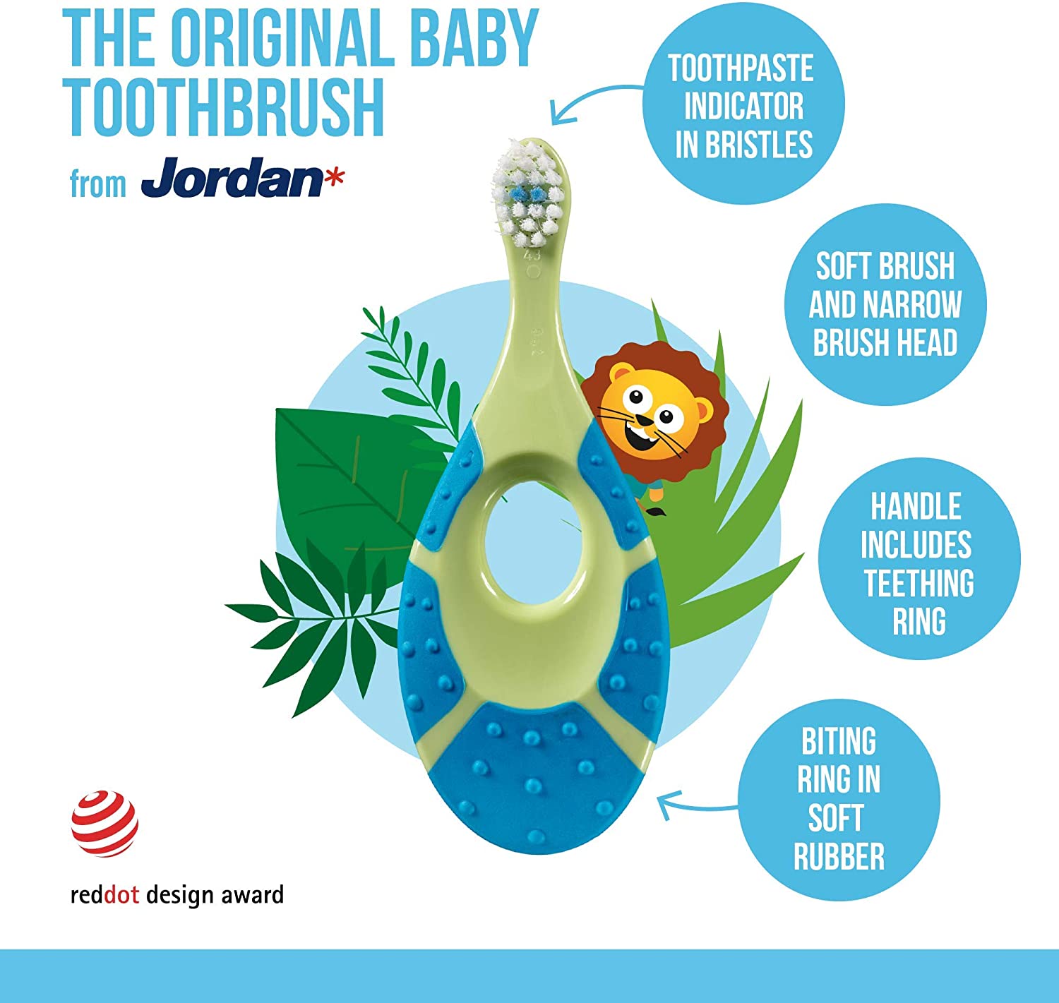 - MADE FOR YOUR BABY - Jordan* is the original brand of this infant toothbrush designed with extra soft bristles, a soft biting ring for babies gums, and a handle that suits adults and babies