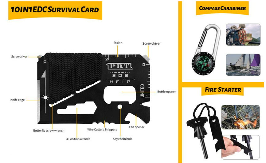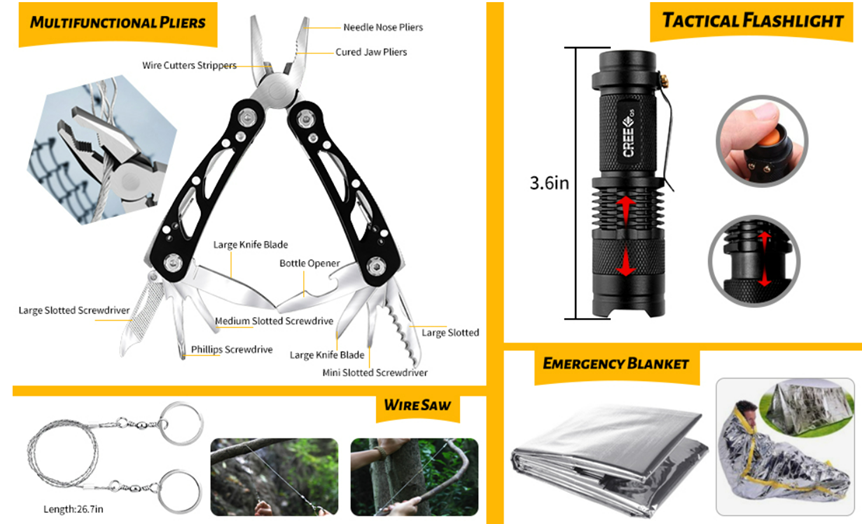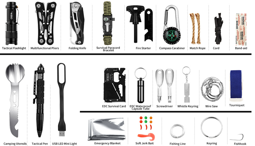Included Components‎Whistle, Knife, Water Bottle Clip, Wire Saw, Flint, Tactical Flashlight, Hooks, Flashlight, Waterproof Box, Compass
