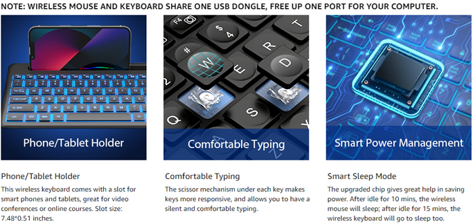 NOTE: WIRELESS MOUSE AND KEYBOARD SHARE ONE USB DONGLE, FREE UP ONE PORT FOR YOUR COMPUTER.