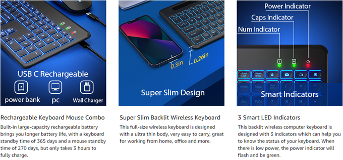 • Rechargeable and Long-lasting: Upgraded rechargeable battery with 30% longer life. Only needs to be charged for 3-5 hours, up to 365 days keyboard standby time (270 days mouse standby time), more than 400 hours of keyboard use (without backlight).