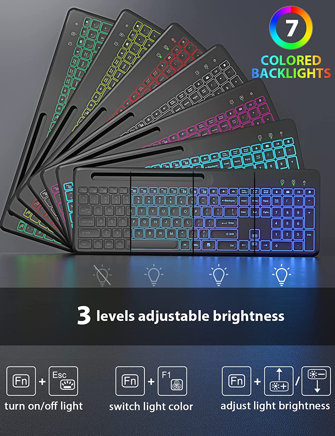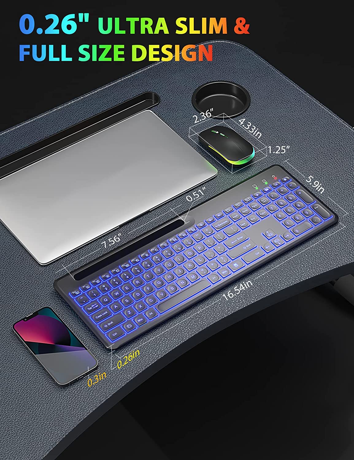 Wireless Keyboard and Mouse Backlit - Slim Keyboard with Phone Holder, Lighted Keys - Silent Rechargeable Cordless Mouse Combo for MacBook, PC, Laptop, Chromebook, by SABLUTE