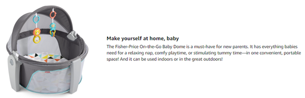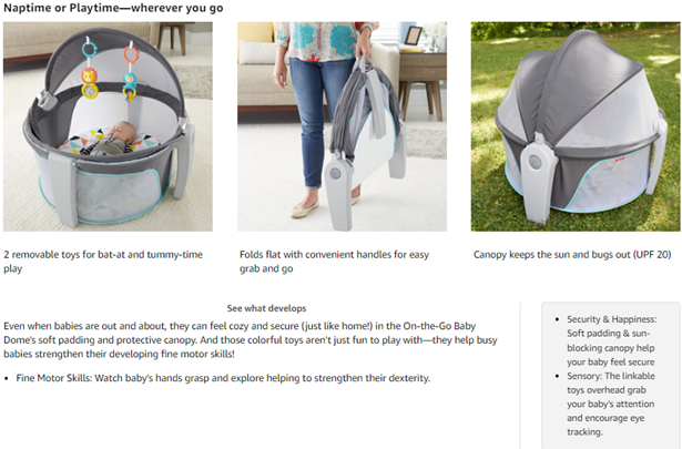 Your baby will feel right at home in the Fisher-Price On-the-Go Baby Dome. It features a comfy pad for your baby to nap or play on and a canopy that protects against pesky bugs and the sun's bright rays. Two colorful toys dangle overhead, which can be removed and placed within your baby's reach for play time. And when you're heading out with your favorite copilot, simply fold the dome and you're ready for the next adventure! Use only with a child who is unable to push up on hands and knees, pull up or sit unassisted.