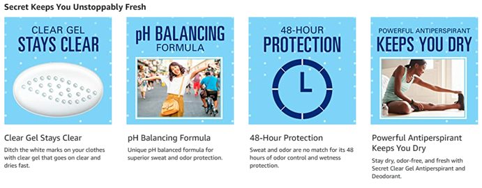 Designed with scents that last, the Secret Fresh Collection has scents you love. Secret Antipirspirant and Deodorant for Women Fresh Clear Gel immediately fights odor and provides 48-hour sweat and odor protection, helping you stay fresh and confident day in and day out. Secret’s unique clear gel formula goes on clear, dries fast, and provides a burst of freshness that lasts all day long. Secret Fresh Clear Gel with pH Balancing Minerals is nothing but fresh for 48 hours.
