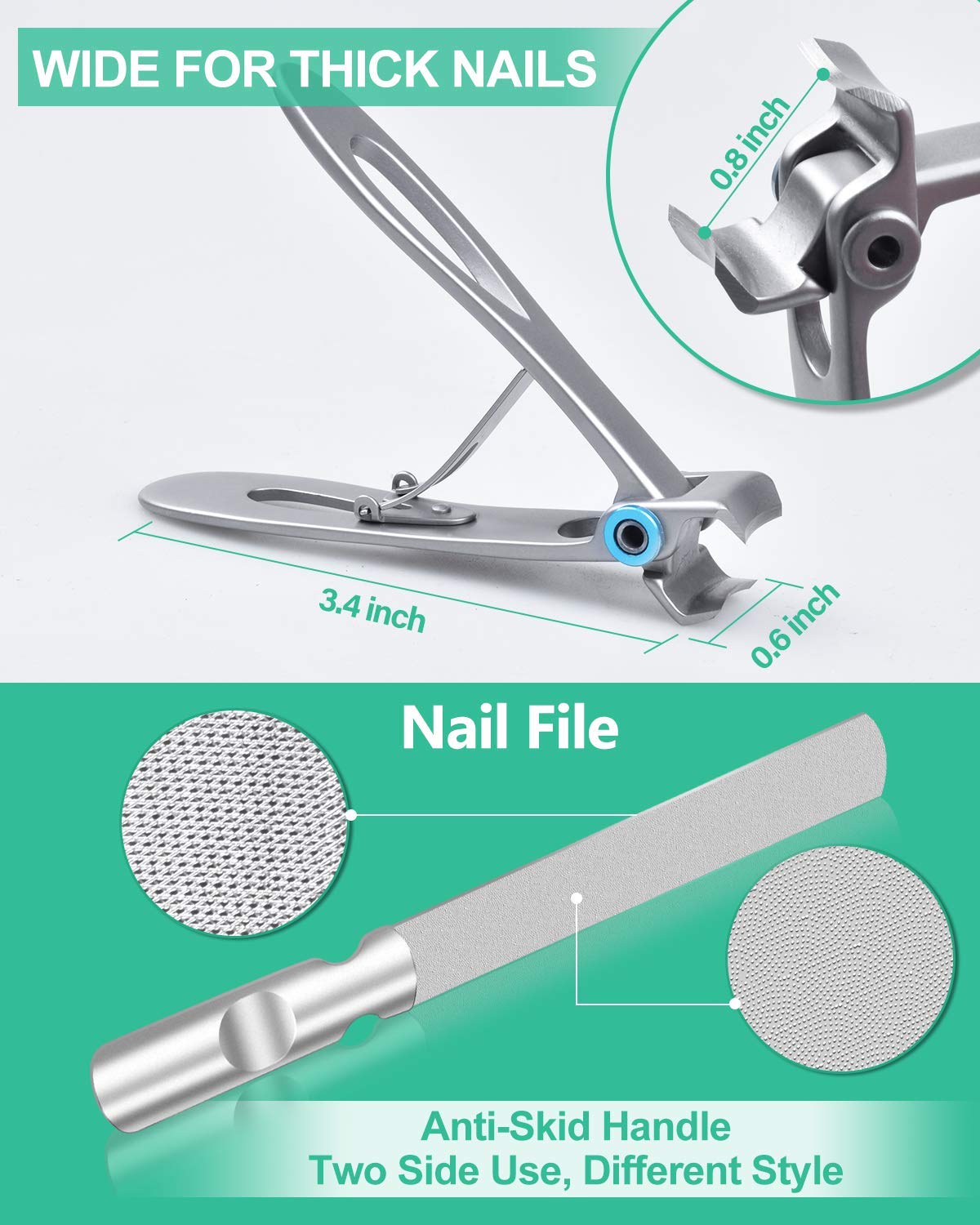 • 【Nail Clippers For Thick Nails】1.5 inch Wide Jaw Heavy Duty Large Nail Clippers Use AUS-34 Steel Sharp Curved Blade provide an easier effort to cut thick ingrown thick toenails; Wide and Strong Clipper Head, Enhance The Cutting Effect; Rubber Handle make this toenail nipper lighter and safer to use in daily life.