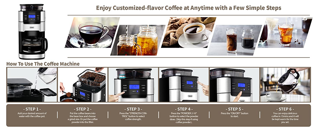 - ☕ 【AUTOMATIC START FUNCTION】: Entering the timer mode and setting the time you wanted to automatic start, the programmable timer will preset the machine start time and start brewing coffee at the specified time. There is a prompt bell after brewing. It helps to save time making coffee in the morning. After brewing, there is a warming plate design that the coffee can be warmed in the carafe lasts for 120 minutes.