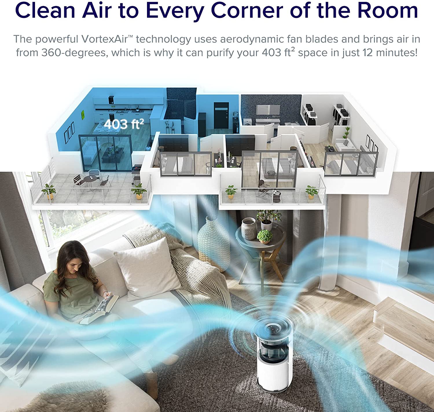 - Intelligently purifies the air in a 403 sq ft room 5x per hour