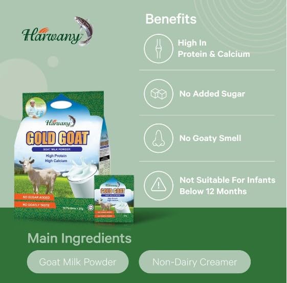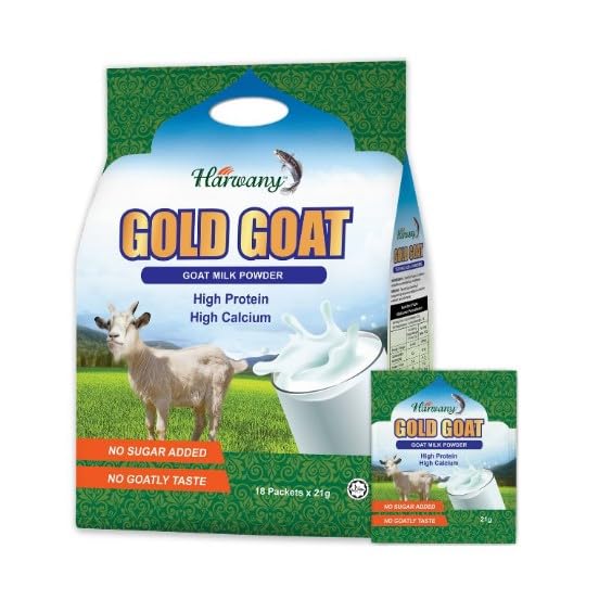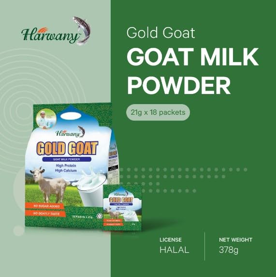 Harwany Gold Goat Goat Milk Powder (18s x 21g) 378g - Goats milk is highly nutritious, contains essential vitamins and minerals (and higher amounts of potassium, iron and vit A than cows’ milk