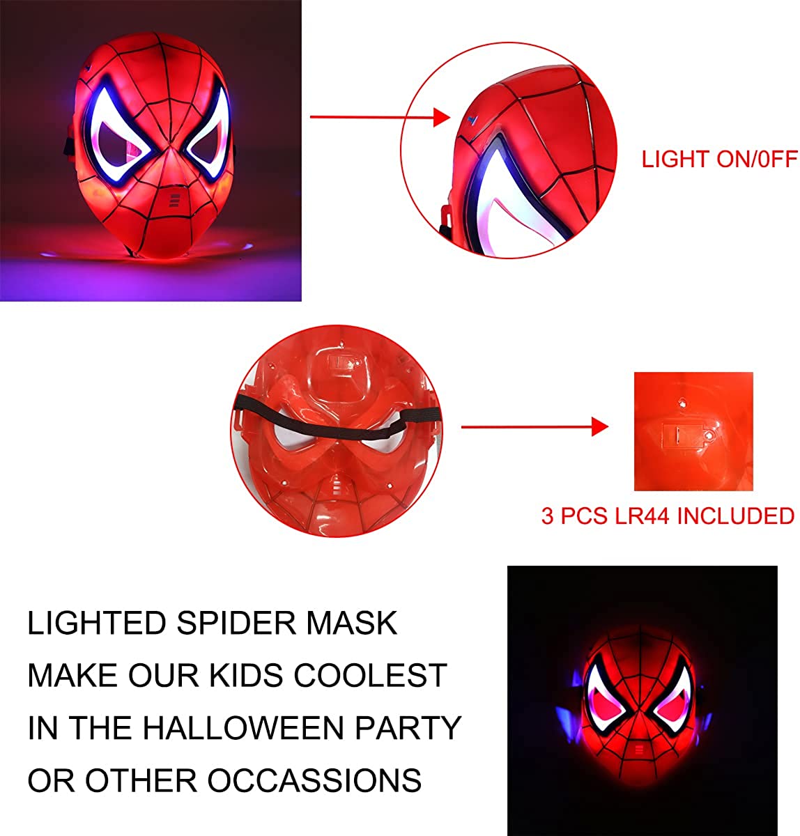 • REAL SUPERHERO COSTUME LED MASK,EYE MASK AND CAPE:Wear the Superhero Eye Mask or the Led Mask(ligh on/off),Dress on the Superhero Cape,Put on the spider web red glove,our boys girls are the most cool superhero.With this full superhero costume set,our kids are ready to join Birthday party,Halloween or Christmas Party etc.