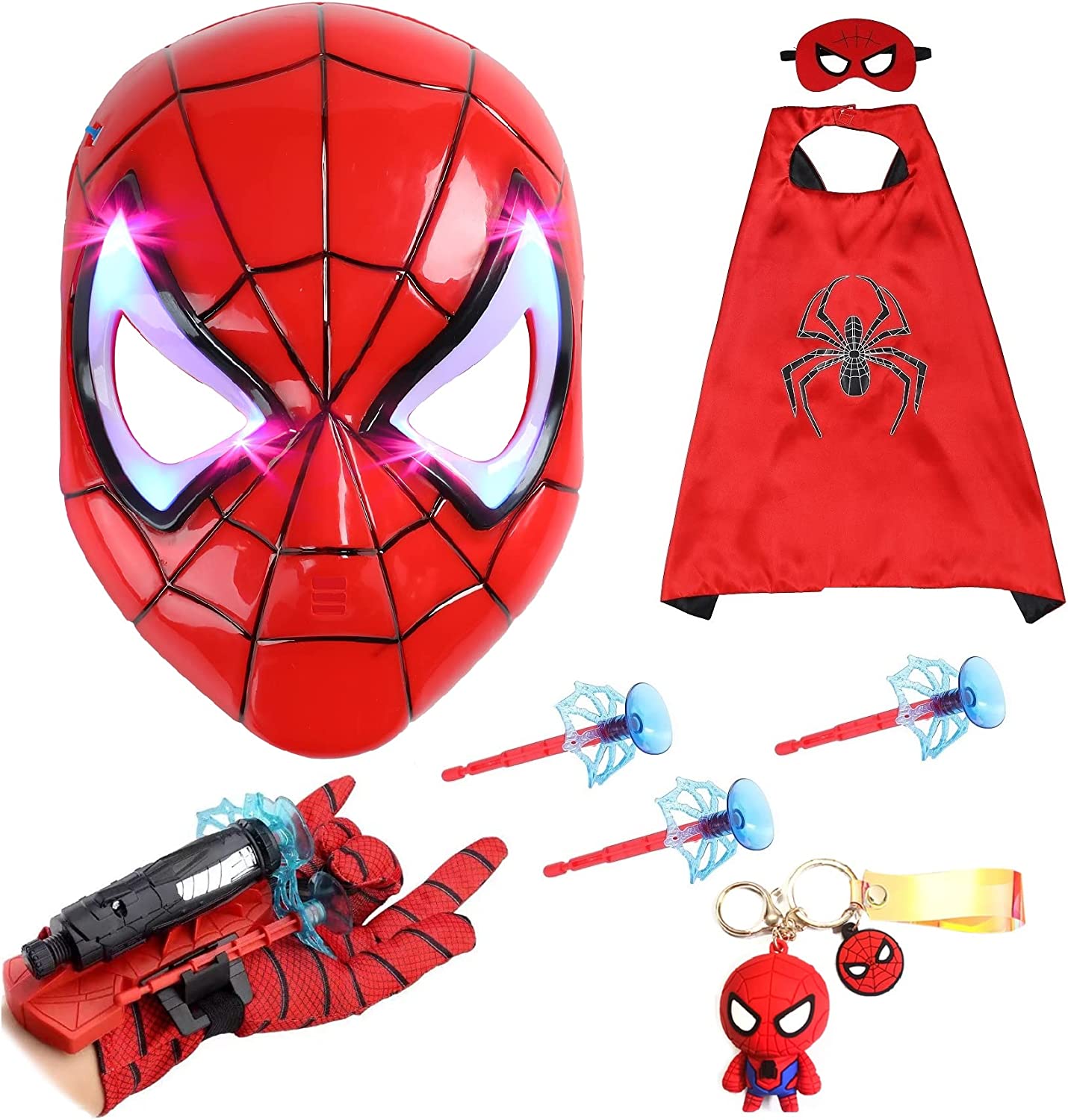 • DREAMING SUPERHERO PLAYSET FOR KIDS: 1PC Web Shooter with 3 toy launchers,1PC Led Mask,1PC Superhero Cape,1PC Felt Eye Mask,1PC Spider Toy Keychain for Backpack